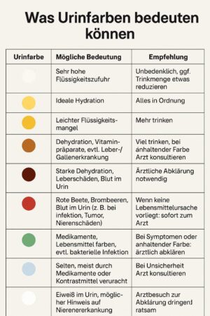 - Urinfarbe ist kein Diagnosemittel, kann aber auf gesundheitliche Veränderungen hinweisen.